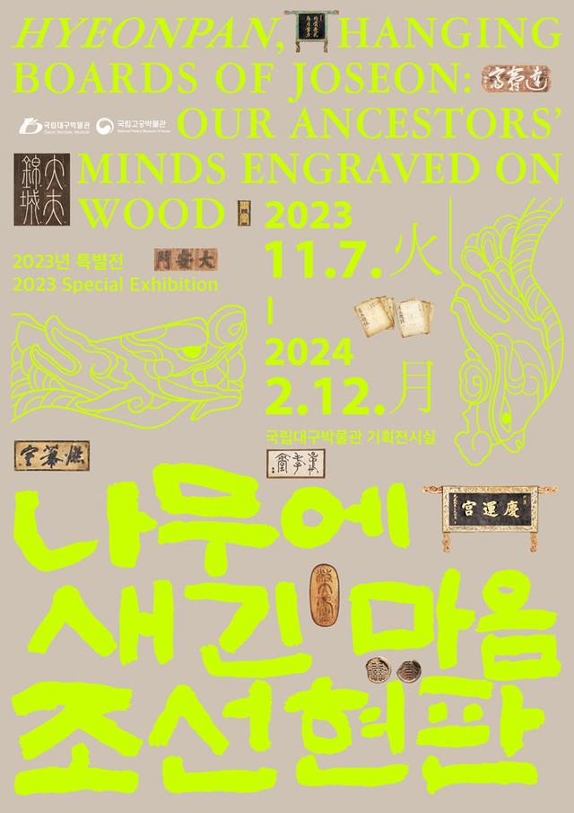 이번 전시에서는 바로 ‘나뭇결에 새겨진 역사’로서 현판을 바라보고자 한다. 기존 2022년 국립고궁박물관에서 개최하였던 특별전 ‘조선의 이상을 걸다, 궁중현판’ 전시에 출품되었던 주요 현판을 비롯하여 영남지역을 중심으로 하는 민간의 현판 등을 함께 살펴볼 수 있는 좋은 기회가 될 것이다.